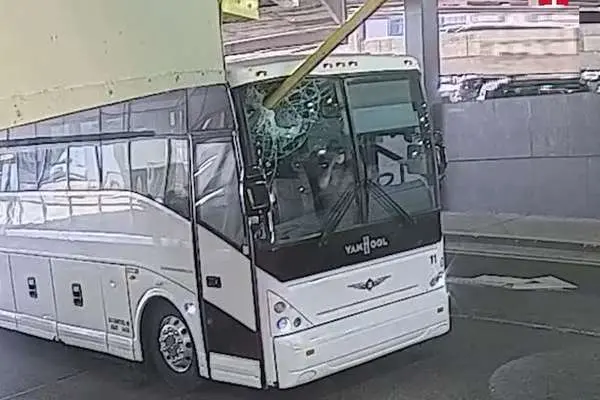 برخورد وحشتناک اتوبوس با مانع ارتفاع
